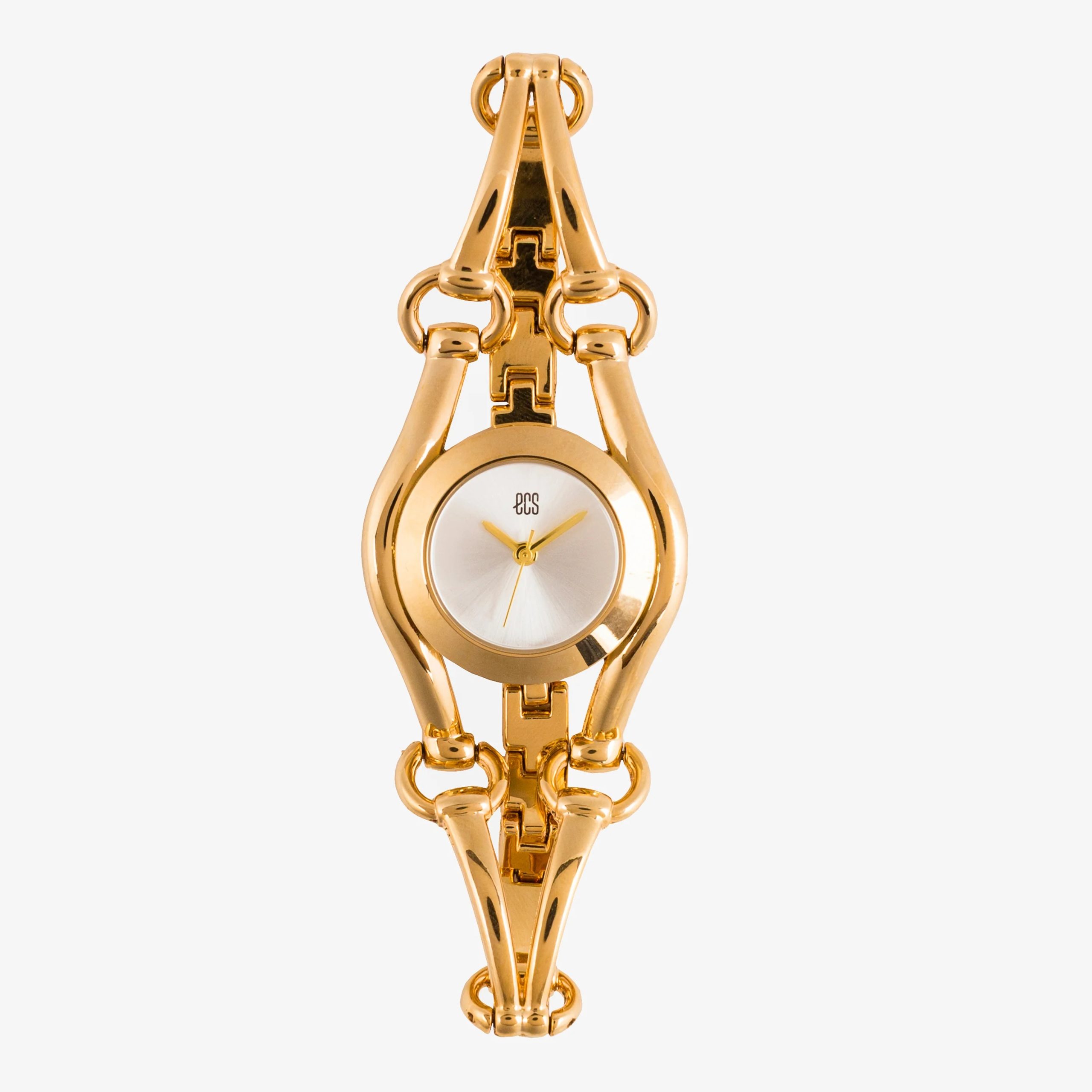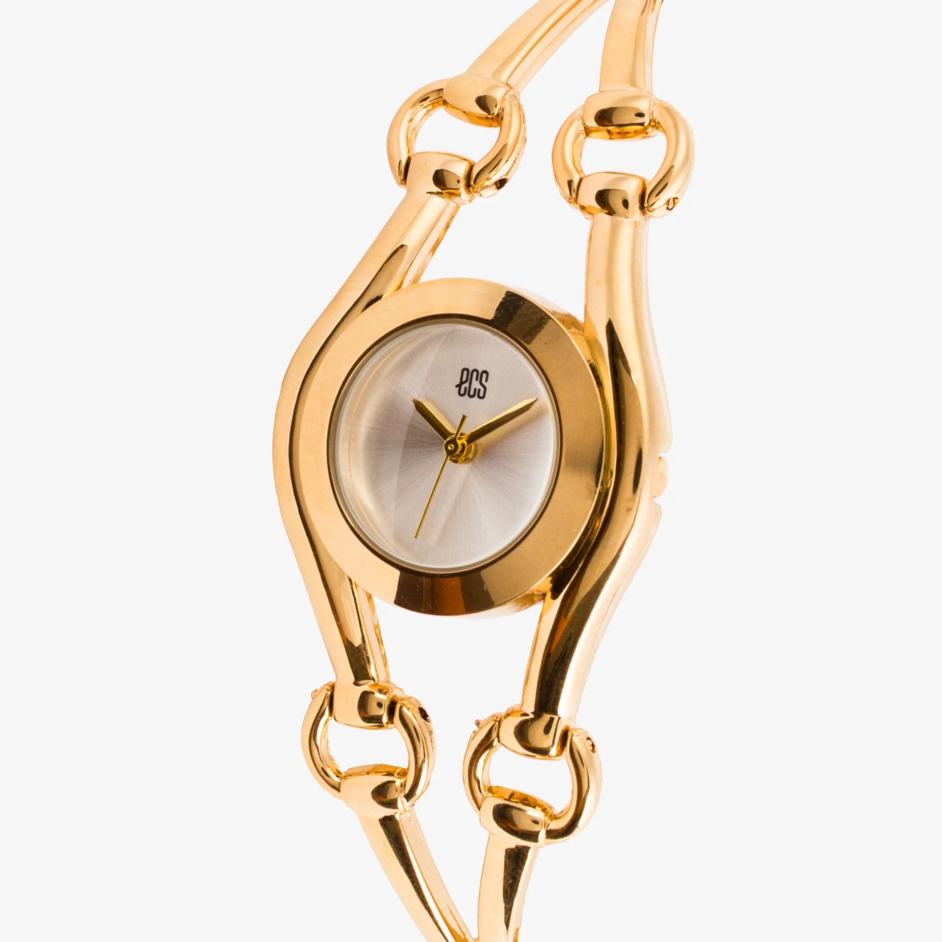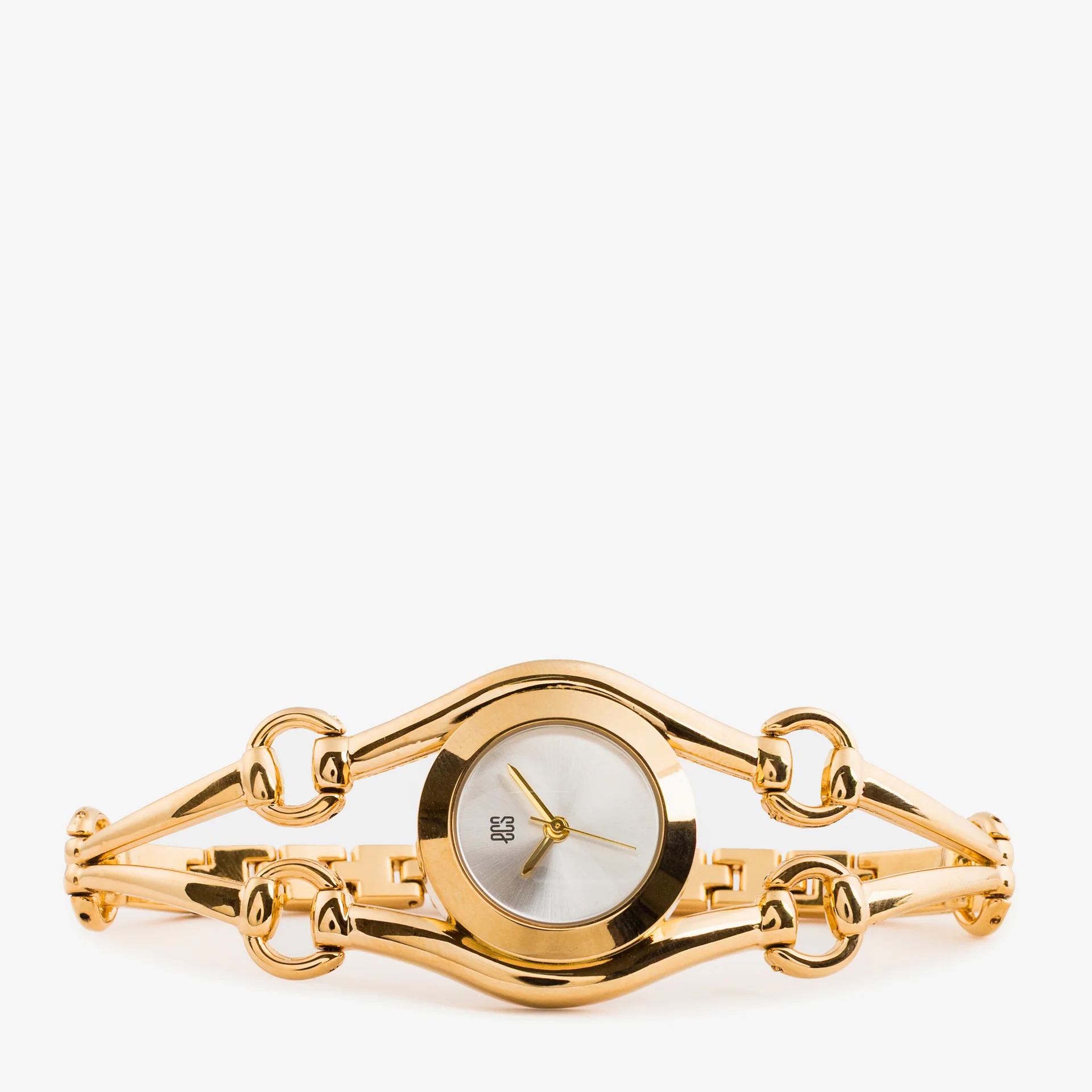 and hands, encased within a polished frame. The distinctive bracelet is composed of flowing, sculpted