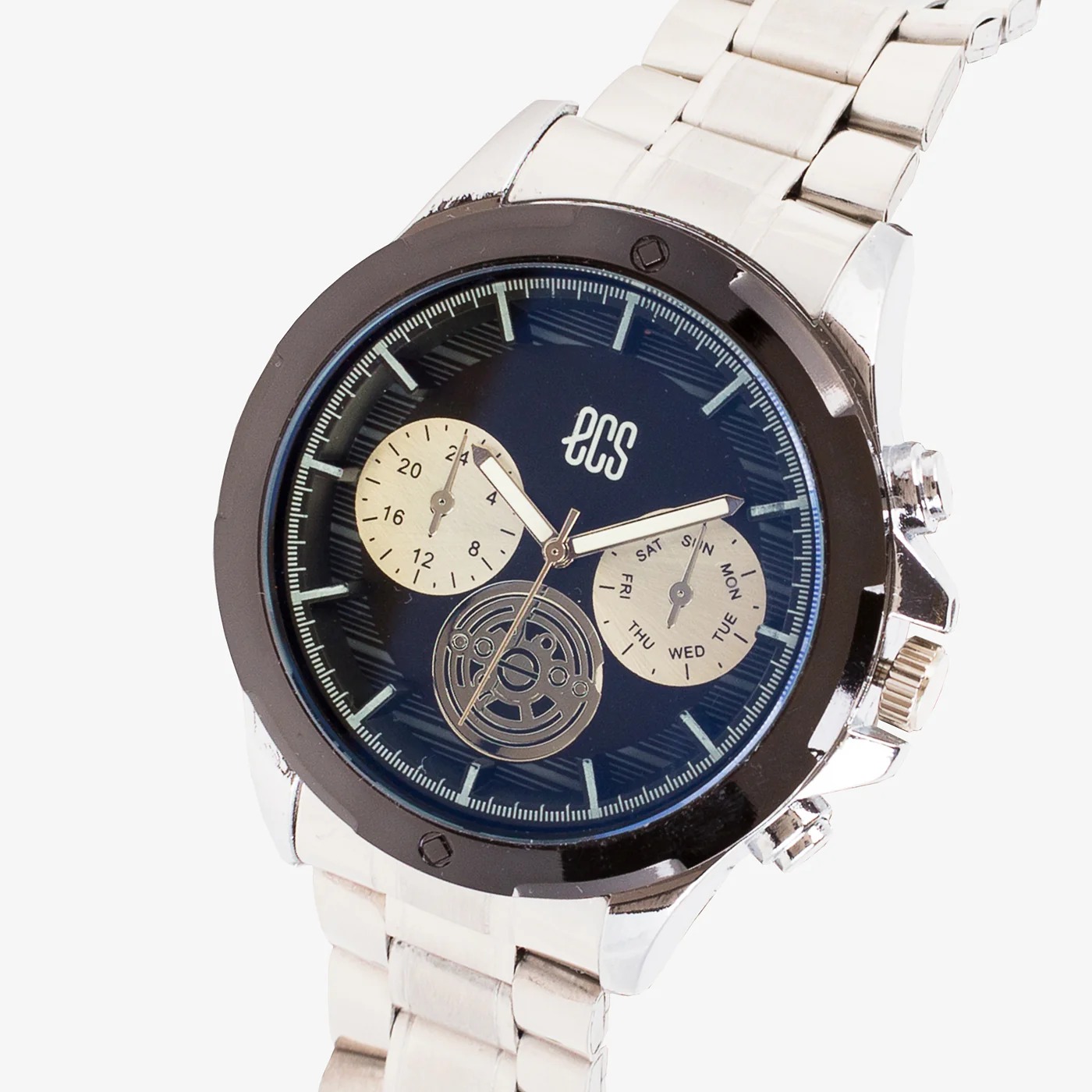 This analogue watch features a sophisticated round dial with bold markers and multiple sub-dials